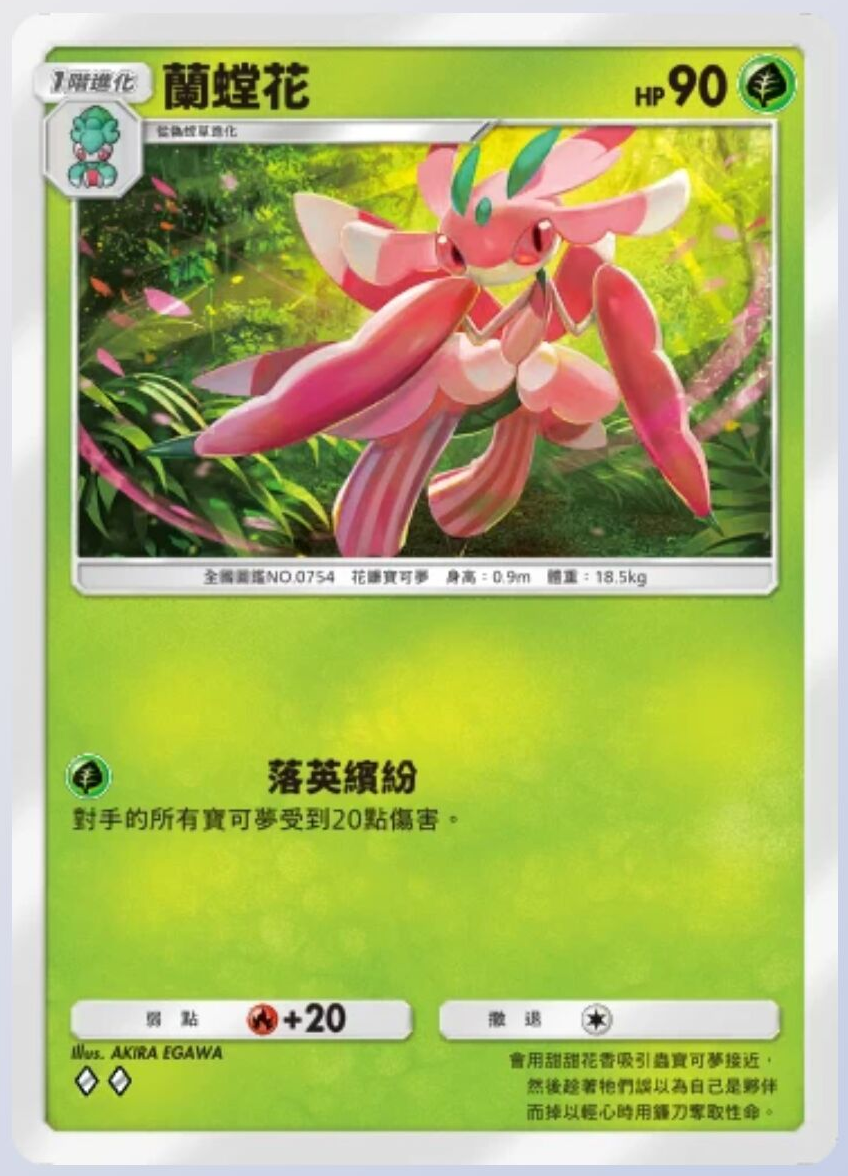 兰螳花 基础信息 兰螳花种类花镰宝可梦宝可梦1阶进化HP90属性撤退弱点 +20系列A绘师AKIRA EGAWA身高0.9m体重18.5kgA3 015/155卡牌简介会用甜甜花香吸引虫宝可梦接近,然后趁着它们误以为自己是伙伴而掉以轻心时用镰刀夺取性命。 技能 落英缤纷对手的所有宝可梦受到20点伤害。