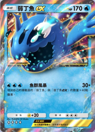 弱丁鱼ex 基础信息 弱丁鱼ex宝可梦基础HP170属性撤退弱点 +20系列A绘师PLANETA CG WorksA3 051/155 技能 鱼群风暴伤害:30+增加自己的备战区的「弱丁鱼」与「弱丁鱼ex」的数量x40点伤害。