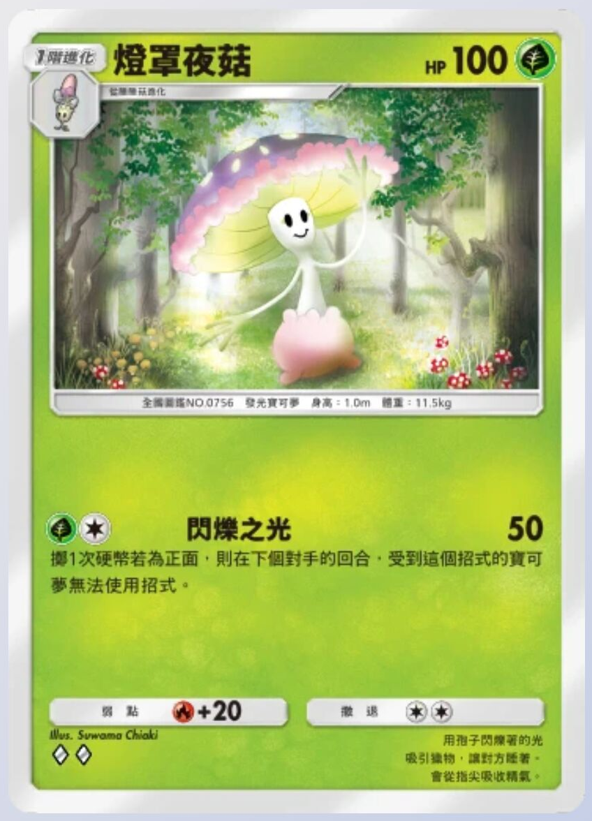 灯罩夜菇 基础信息 灯罩夜菇种类发光宝可梦宝可梦1阶进化HP90属性撤退弱点+20系列A绘师Suwama Chiaki身高1.0m体重11.5kgA3 017/155卡牌简介用孢子闪烁着的光吸引猎物,让对方睡着。会从指尖吸收精气。 技能 闪烁之光伤害:50掷1次硬币若为正面,则在下个对手的回合,受到这个招式的宝可梦无法使用招式。