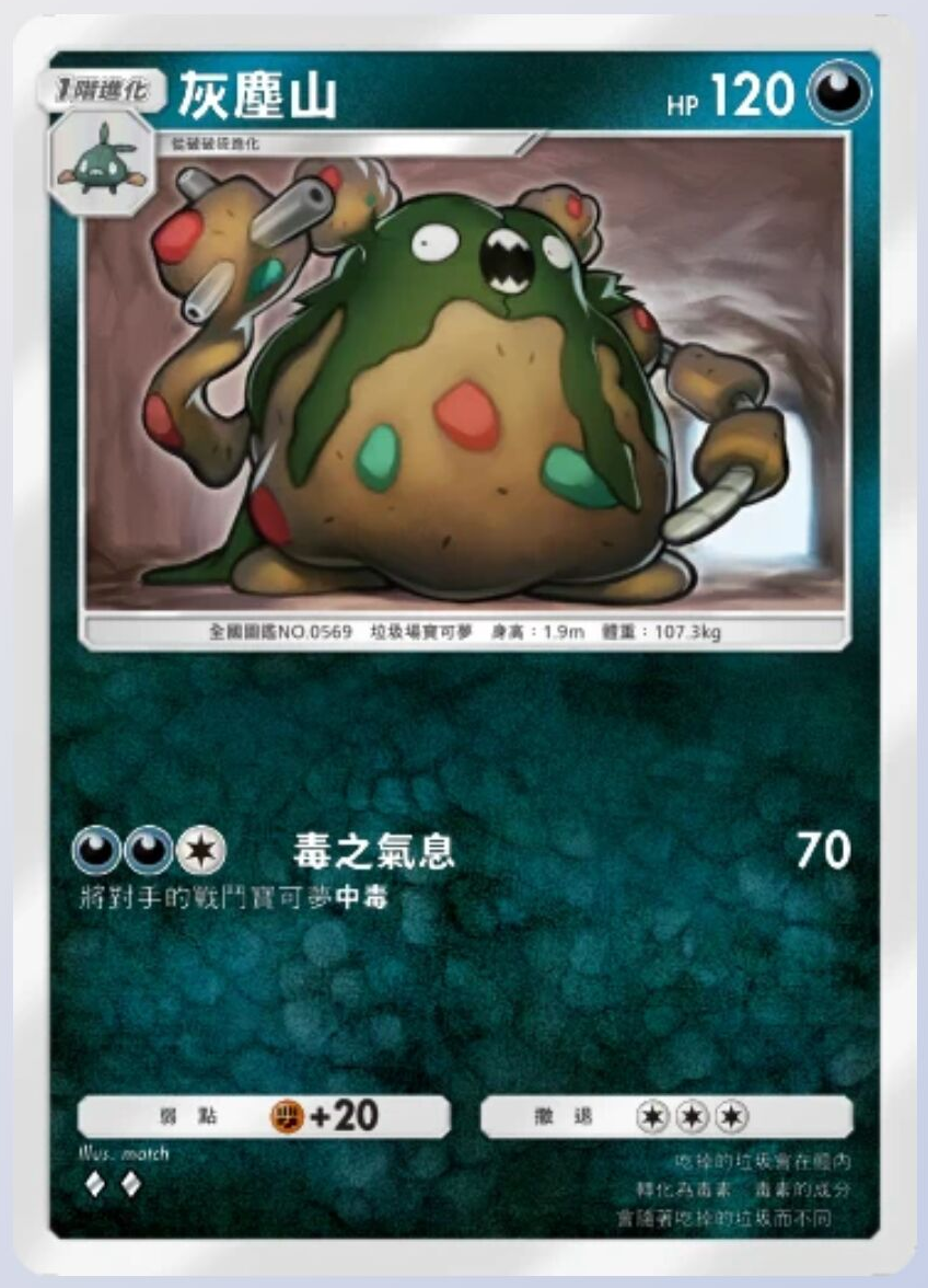 灰尘山 基础信息 灰尘山种类垃圾场宝可梦宝可梦1阶进化HP120属性撤退弱点 +20系列A绘师match身高1.9m体重107.3kgA3 114/155卡牌简介吃掉的垃圾会在体内转化为毒素。毒素的成分会随着吃掉的垃圾而不同。 技能 毒之气息伤害:70将对手的战斗宝可梦中毒。
