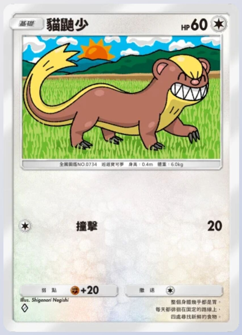 猫鼬少 基础信息 猫鼬少种类巡回宝可梦宝可梦基础HP60属性撤退弱点+20系列A绘师Shigenori Negishi身高0.4m体重6.0kgA3 136/155卡牌简介整个身体几乎都是胃。每天都徘徊在固定的路线上,四处寻找新鲜的食物。 技能 撞击伤害:20