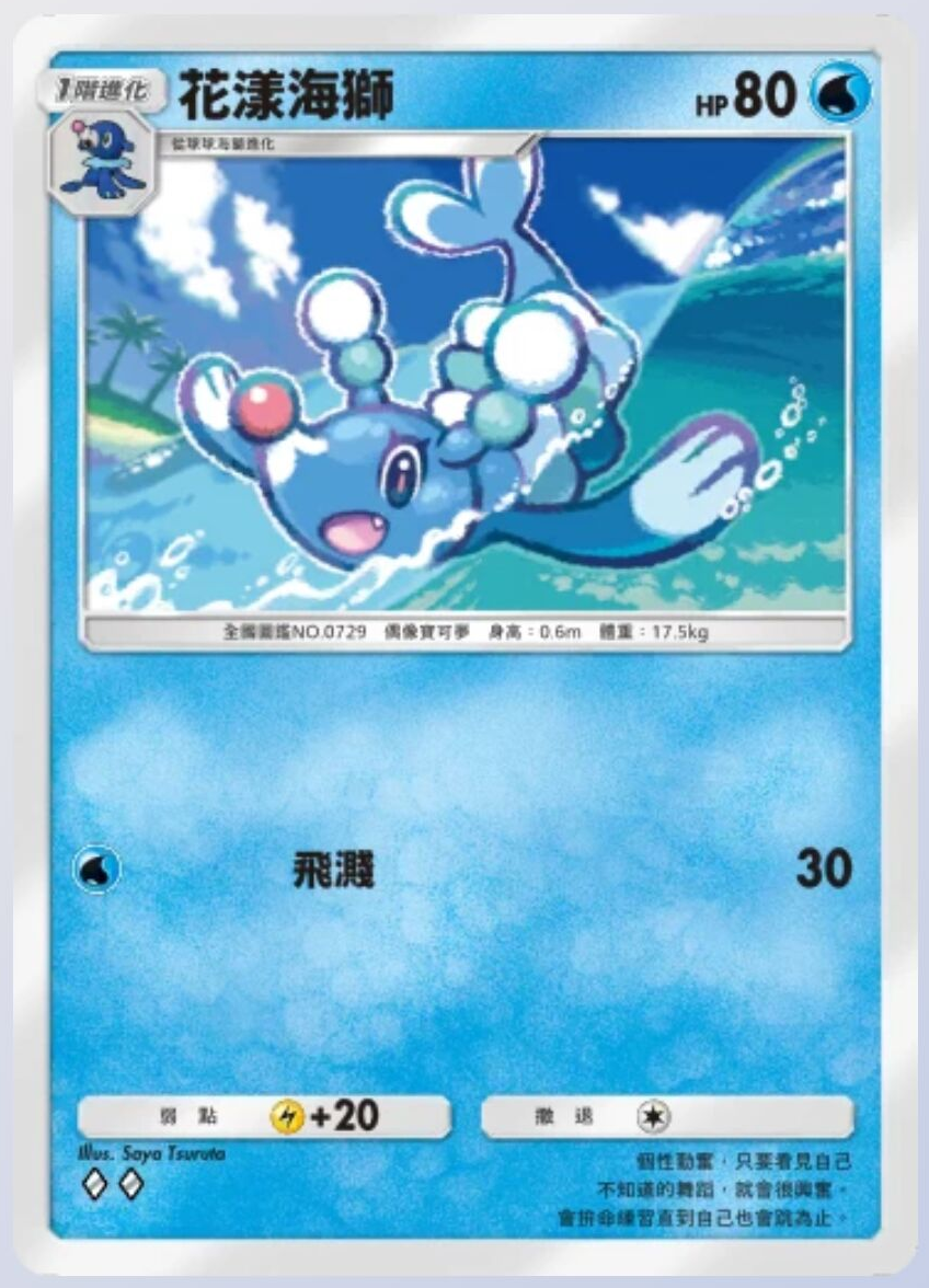 花漾海狮 基础信息 花漾海狮种类偶像宝可梦宝可梦1阶进化HP80属性撤退弱点 +20系列A绘师Saya Tsuruta身高0.6m体重17.5kgA3 047/155卡牌简介个性勤奋,只要看见自己不知道的舞蹈,就会很兴奋。会拚命练习直到自己也会跳为止。 技能 飞溅伤害:30