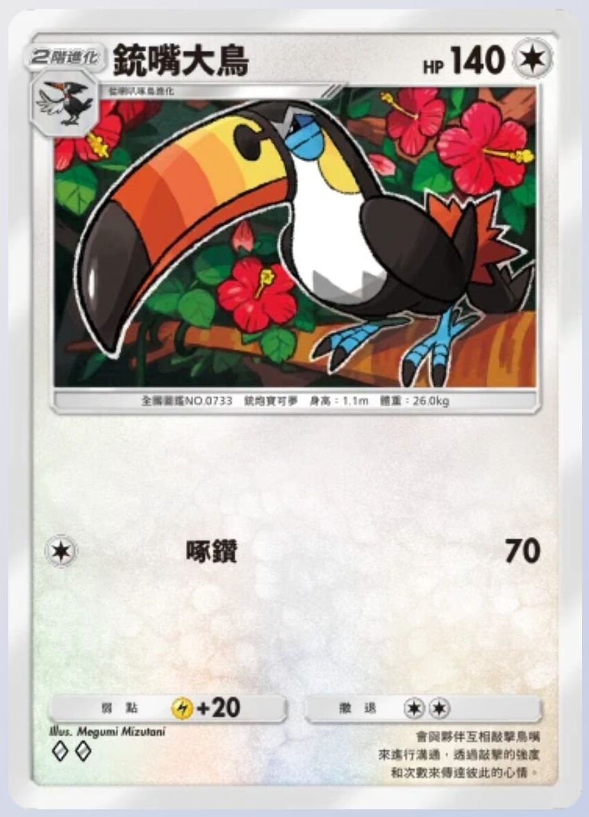 铳嘴大鸟 基础信息 铳嘴大鸟种类铳炮宝可梦宝可梦2阶进化HP140属性撤退弱点+20系列A绘师Megumi Mizutani身高1.1m体重26.0kgA3 135/155卡牌简介会与伙伴互相敲击鸟嘴来进行沟通,透过敲击的强度和次数来传达彼此的心情。 技能 啄钻伤害:70
