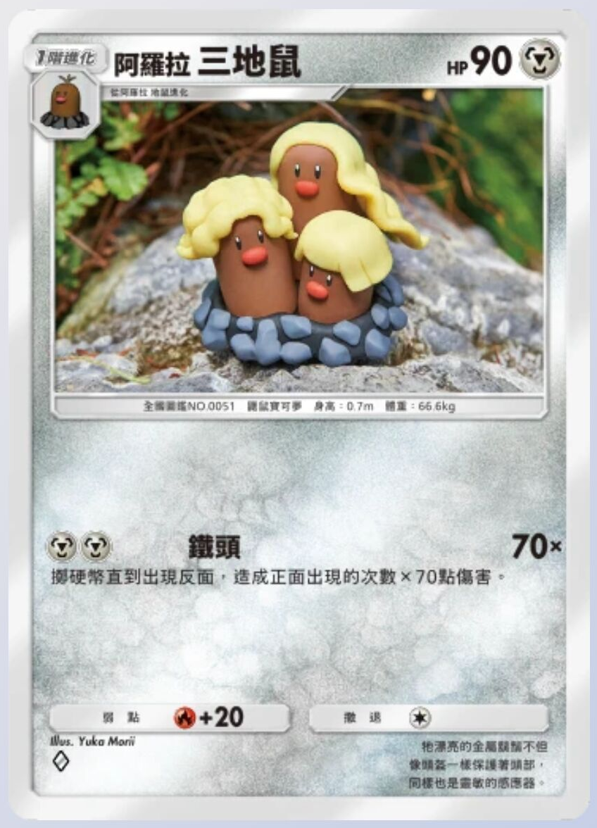 阿罗拉三地鼠 基础信息 阿罗拉三地鼠种类鼹鼠宝可梦宝可梦1阶进化HP90属性撤退弱点 +20系列A绘师Yuka Morii身高0.7m体重66.6kgA3 118/155卡牌简介它漂亮的金属胡须不但像头盔一样保护着头部,同样也是灵敏的感应器。 技能 铁头伤害:70*掷硬币直到出现反面,造成正面出现的次数x70点伤害。