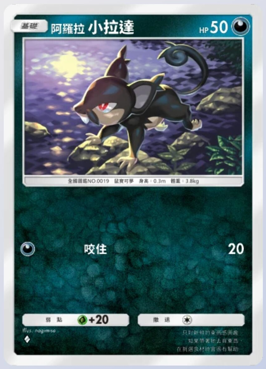 阿罗拉小拉达 基础信息 阿罗拉小拉达种类鼠宝可梦宝可梦基础HP50属性撤退弱点 +20系列A绘师nagimiso身高0.3m体重3.8kgA3 106/155卡牌简介只对新鲜的东西感兴趣。如果带着它去买东西,在挑选食材时会很有帮助。 技能 咬住伤害:20
