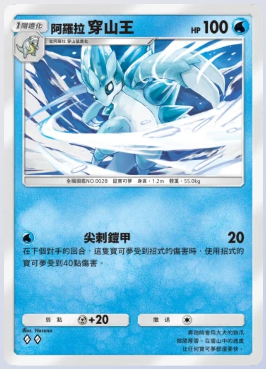 阿罗拉穿山王 基础信息 阿罗拉穿山鼠种类鼠宝可梦宝可梦1阶进化HP100属性撤退弱点 +20系列A绘师Hasuno身高1.2m体重55.0kgA3 039/155卡牌简介奔跑时会用大大的钩爪拨开厚雪。在雪山中的速度比任何宝可梦都还要快。 技能 尖刺铠甲伤害:20在下个对手的回合,这只宝可梦受到招式的伤害时,使用招式的宝可梦受到40点伤害。