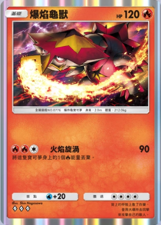 爆焰龟兽 基础信息 爆焰龟兽种类爆炸龟宝可梦宝可梦基础HP120属性撤退弱点 +20系列A绘师Shin Nagasawa身高2.0m体重212.0kgA3 037/155卡牌简介背上的甲壳上敷了炸药。会用大爆炸去回击来攻击自己的敌人。 技能 火焰旋涡伤害:90将这只宝可梦身上的1个火属性能量丢弃。