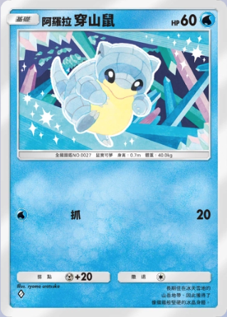 阿罗拉穿山鼠 基础信息 阿罗拉穿山鼠种类鼠宝可梦宝可梦基础HP60属性撤退弱点 +20系列A绘师ryoma uratsuka身高0.7m体重40.0kgA3 038/155卡牌简介长期住在冰天雪地的山岳地带,因此获得了像钢铁般坚硬的冰晶身体。 技能 抓伤害:20