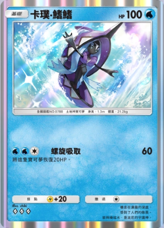 卡璞·鳍鳍 基础信息 卡璞·鳍鳍种类土地神宝可梦宝可梦基础HP100属性撤退弱点 +20系列A绘师chibi身高1.3m体重21.2kgA3 056/155卡牌简介栖息在浓雾的深处,受到了人们的敬畏。能够操纵水,是波尼的守护神。 技能 螺旋吸收伤害:60将这只宝可梦恢复20HP。