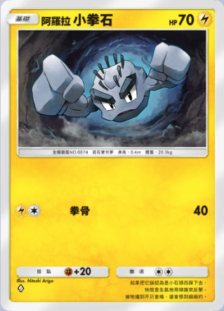 阿罗拉小拳石 基础信息 阿罗拉小拳石种类岩石宝可梦宝可梦基础HP70属性撤退弱点 +20系列A绘师Naoyo Kimura身高0.4m体重20.3kgA3 059/155卡牌简介如果把它误认为是小石头而踩下去,它就会生气地用头锤来反击。被它撞到不只会痛,还会感到麻麻的。 技能 拳骨伤害:40