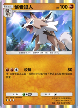 鬃岩狼人-白昼 基础信息 鬃岩狼人种类狼宝可梦宝可梦1阶进化HP100属性撤退弱点 +20系列A绘师Atsushi Furusawa身高0.8m体重25.0kgA3 100/155卡牌简介会用尖牙和利爪袭击猎物。只要是信赖的训练家下的指令,它都会忠实地听从。 技能 咬碎伤害:80掷1次硬币若为正面,则将对手的战斗宝可梦身上的随机1个能量丢弃。