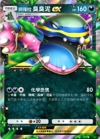 阿罗拉臭臭泥ex 基础信息 阿罗拉臭臭泥ex宝可梦1阶进化HP160属性撤退弱点 +20系列A绘师PLANETA CG WorksA3 111/155 技能 化学恐慌伤害:80从中毒、灼伤、睡眠、麻痹、混乱中会随机被选出1种,让对手的战斗宝可梦陷入该特殊状态。不会选出已经受到的特殊状态。