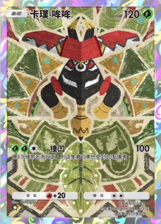 卡璞·哞哞 基础信息 卡璞·哞哞种类土地神宝可梦宝可梦基础HP120属性撤退弱点 +20系列A绘师OKACHEKE身高1.9m体重45.5kgA3 159/155卡牌简介虽被称呼为守护神,但有着会将自己视为敌人的对手彻底击溃的狂暴个性。 技能 撞凹伤害:100掷1次硬币若为反面,则这只宝可梦也受到20点伤害。