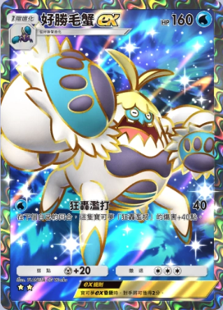好胜毛蟹ex 基础信息 好胜毛蟹ex宝可梦1阶进化HP160属性撤退弱点 +20系列A绘师PLANETA CG WorksA3 183/155 技能 狂轰滥打伤害:40在下个自己的回合,这只宝可梦「狂轰滥打」的伤害+40点。