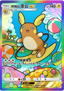 阿罗拉雷丘ex 基础信息 阿罗拉雷丘ex宝可梦1阶进化HP140属性撤退弱点 +20系列A绘师Yoshimi MiyoshiA3 203/155 技能 精神强念伤害:60+增加对手的战斗宝可梦身上的能量的数量x30点伤害。
