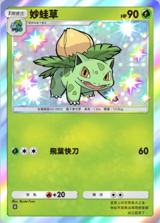 妙蛙草 基础信息 妙蛙草种类种子宝可梦宝可梦1进化HP90属性撤退弱点 +20系列A绘师Ryuta Fuse身高1.0m体重13.0kgA3 211/155卡牌简介当背上的花苞长大之后,它似乎就无法再用雨只脚站立起来了。 技能 飞叶快刀伤害:60