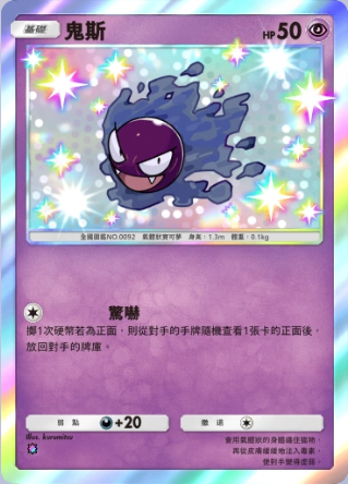 鬼斯 基础信息 鬼斯种类气体状宝可梦宝可梦基础HP60属性撤退弱点 +20系列A绘师kurumitsu身高1.3m体重0.1kgA3 220/155卡牌简介会用气体状的身体缠住猎物,再从皮肤缓缓地注入毒素,使封手变得虚弱。 技能 惊吓掷1次硬币若为正面,则从对手的手牌随机查看1张卡的正面后,放回对手的牌库。