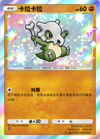 卡拉卡拉 基础信息 卡拉卡拉种类孤独宝可梦宝可梦基础HP60属性撤退弱点 +20系列A绘师Sanosuke Sakuma身高0.4m体重6.5kgA3 226/155卡牌简介当它想起与自己死别的母亲而哭泣时,哭声就会在头上戴的骨头中哀伤地回响。 技能 叫声在下个对手的回合,受到这个招式的宝可梦使用的招式伤害-20点。