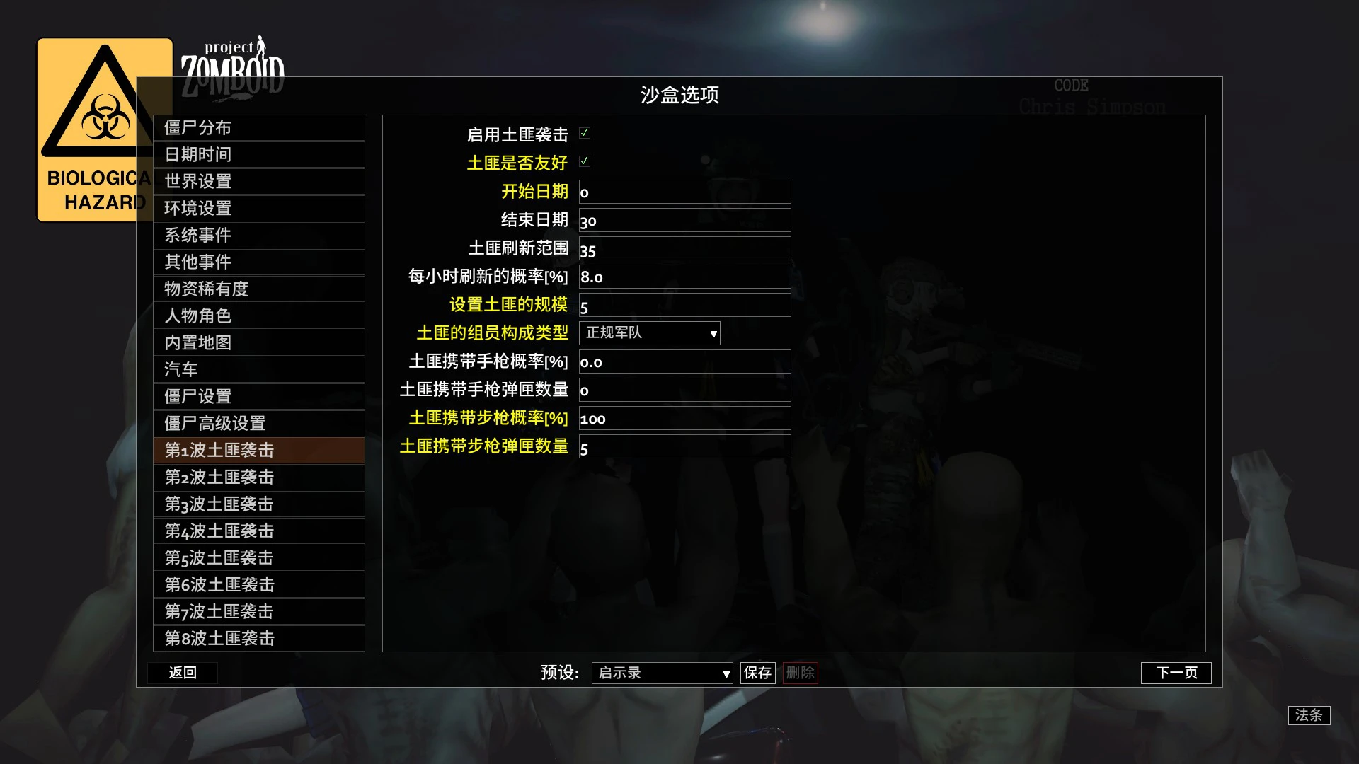 在沙盒设置中,土匪的各项概率是可以调整的,类似刷新概率,刷新时间,土匪种类,是否友好等等 土匪刷新设置分为几个阶段,阶段的时间你可以自由的调整,你完全可以设置为第一阶段土匪类型为军队,将友好打开,这样便是灾难初期,军队还在努力反抗,在之后的阶段中把土匪类型改回真正的土匪,将友好关闭,非常有代入感,世界再也不是你孤单的一个人