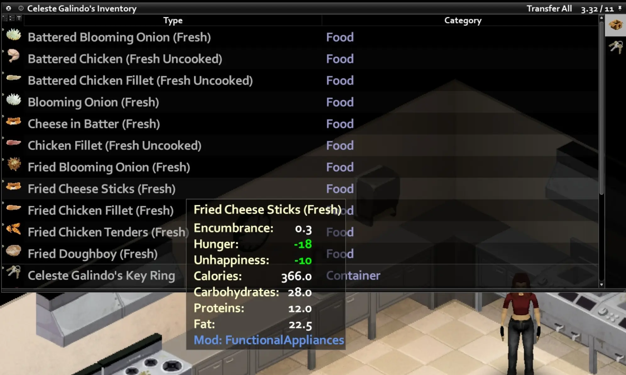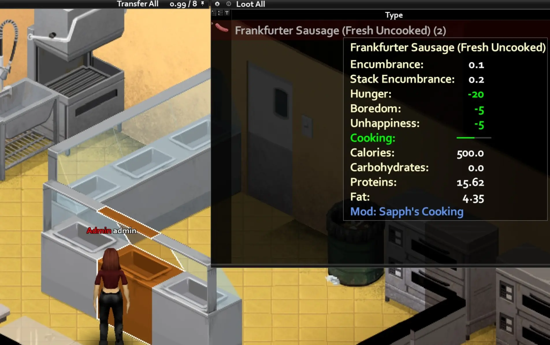 油炸锅现在设置为随机添加植物油。您可以添加和沥干油。如果有电,您可以打开油炸锅,使用 Sapph's Cooking mod 炸各种通常需要油锅的食物。添加了一些新食谱:面团男孩、鸡排、鸡柳、盛开的炸洋葱和炸芝士条。添加了 Sapph's Cooking Oil(萨普食用油),为大桶填充提供了第二种选择。