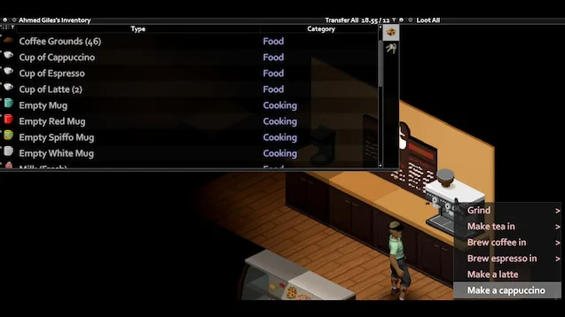 打开机器煮咖啡。用马克杯、茶杯、保温杯或Sapph's的低杯饮料。游戏中即有茶和速溶咖啡,加入Sapph's的配套物品,得到可以在咖啡机上研磨的咖啡豆。然后你可以煮咖啡或浓缩咖啡。将浓缩咖啡与牛奶一起放入浓缩咖啡机中起泡,然后将其制成拿铁或卡布奇诺。在路上,提前往保温瓶里装满煮好的咖啡,就可以倒出香甜的咖啡。在低球杯里煮咖啡也可以添加酒精和Sapph's的相关物品。别忘了你需要电和水。如果水断了,库存中的任何水源都可以用来煮咖啡。