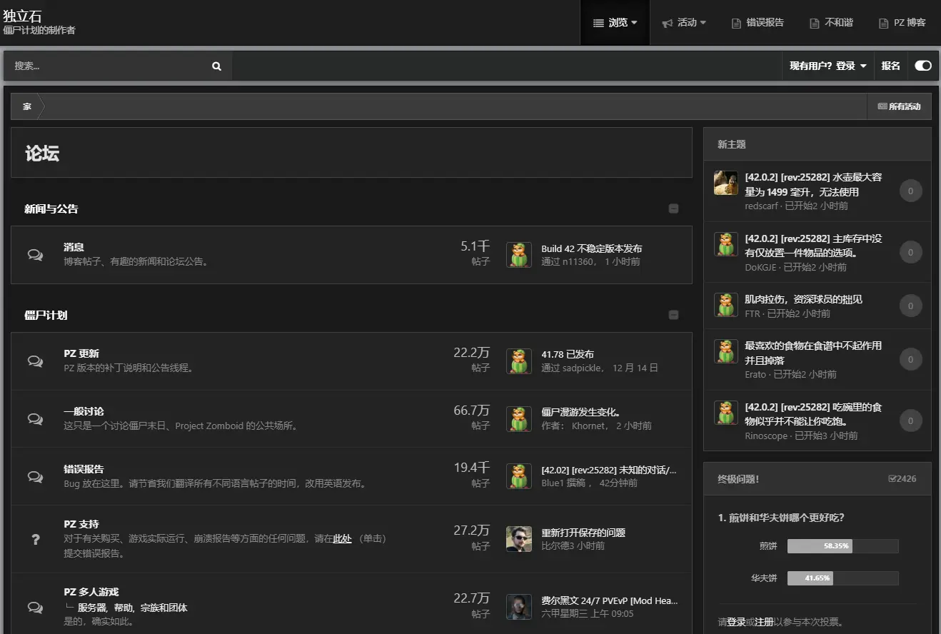 众所周知,2024年12月18日,The Indie Stone公司(以下简称僵毁吉祥物小浣熊)更新了旗下游戏僵尸毁灭工程的Build 42 unstable的最新测试版供玩家测试(人话:拿玩家当小白鼠)。测试版推出后,相信许多玩家没玩不久就发现小浣熊给我们做出了一份从内容来看完成度80%的大饼,而从实际体验来看目前的游戏仍然存在bug众多的情况。这些天我看大家在各个平台都在蛐蛐小浣熊的各种离谱bug,但是小浣熊这种摆烂式国外游戏公司对国内的玩家群体重视度并不高,这就导致bug反馈的门槛比较高。