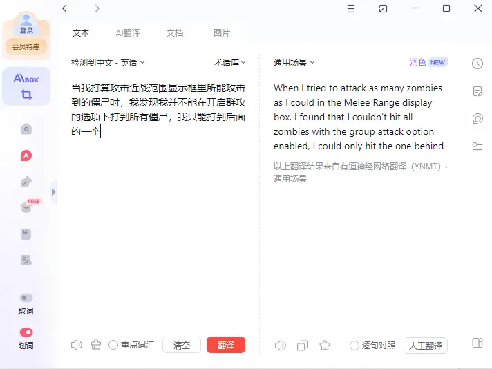 我相信很多小伙伴看到小浣熊bug反馈贴要求你用英文描述就觉得很麻烦,这里提供了一种解决方法,使用英文翻译软件进行翻译,贴主使用的是网易的有道翻译软件对bug描述进行的翻译工作。