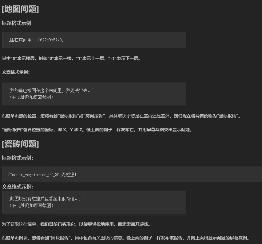 2.在撰写反馈贴时,复现步骤(Reproduction)很重要,请尽量描述清晰(用软件翻译时请尽量描述清楚再翻译),有的物品名词或者游戏设置拿捏不准的可以将游戏调至英文取得原版的描述,处理起来更加准确。