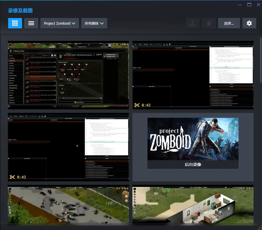 如图2-7,如果我们要找我们所录制的视频,可以在steam游戏库找到僵尸毁灭工程的页面,往下滑动即可找到我们之前的录像和截图。