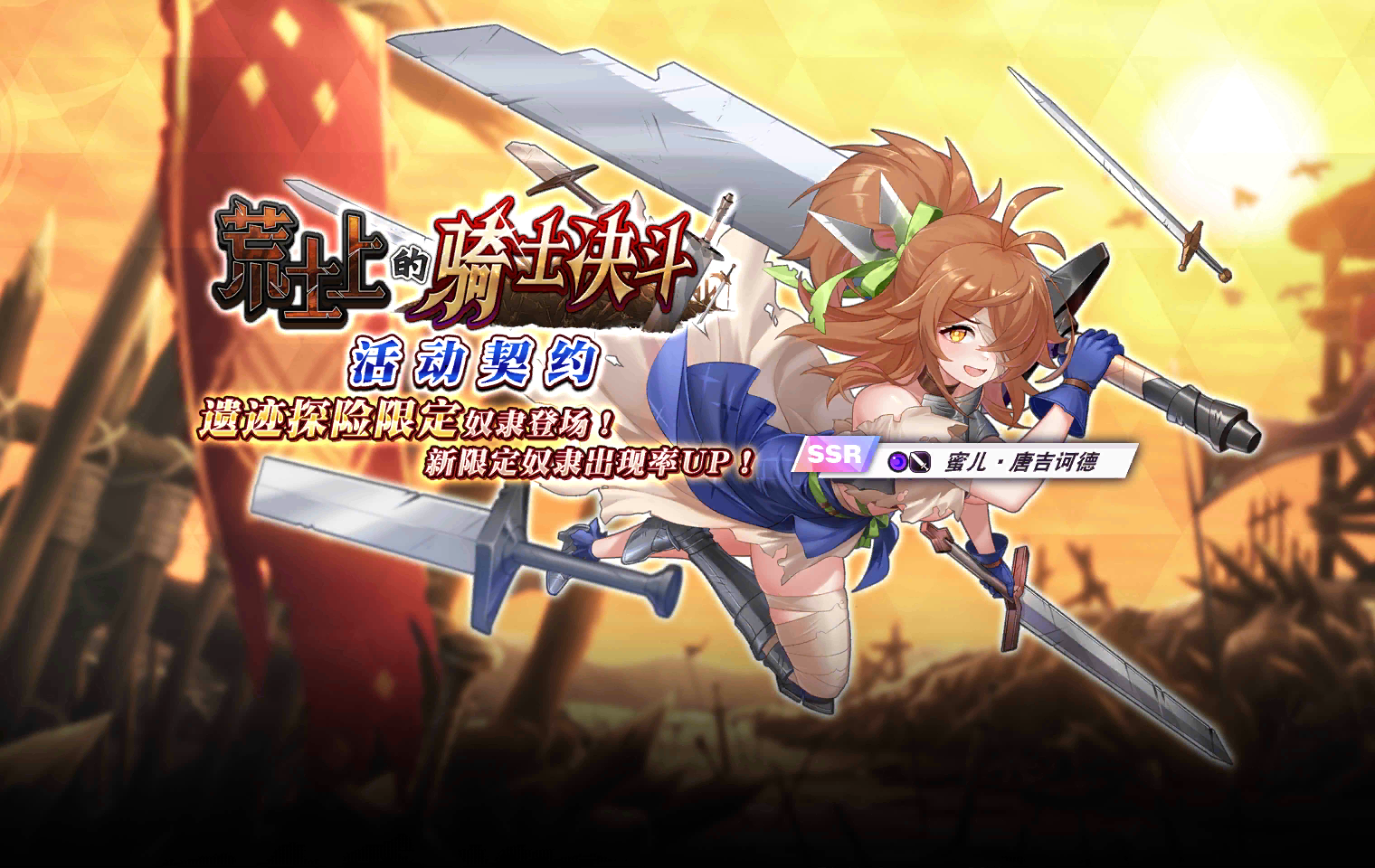 荒土上的骑士决斗活动契约 预览 卡池信息 荒土上的骑士决斗活动契约卡池期限2025.6.19是否限定是是否复刻否是否FES否卡池简述蜜儿・唐吉诃德、安限定UP池 概率公示 当期UP1.00%SSR(包含当期UP)3.00%SR17.00%R80.00%
