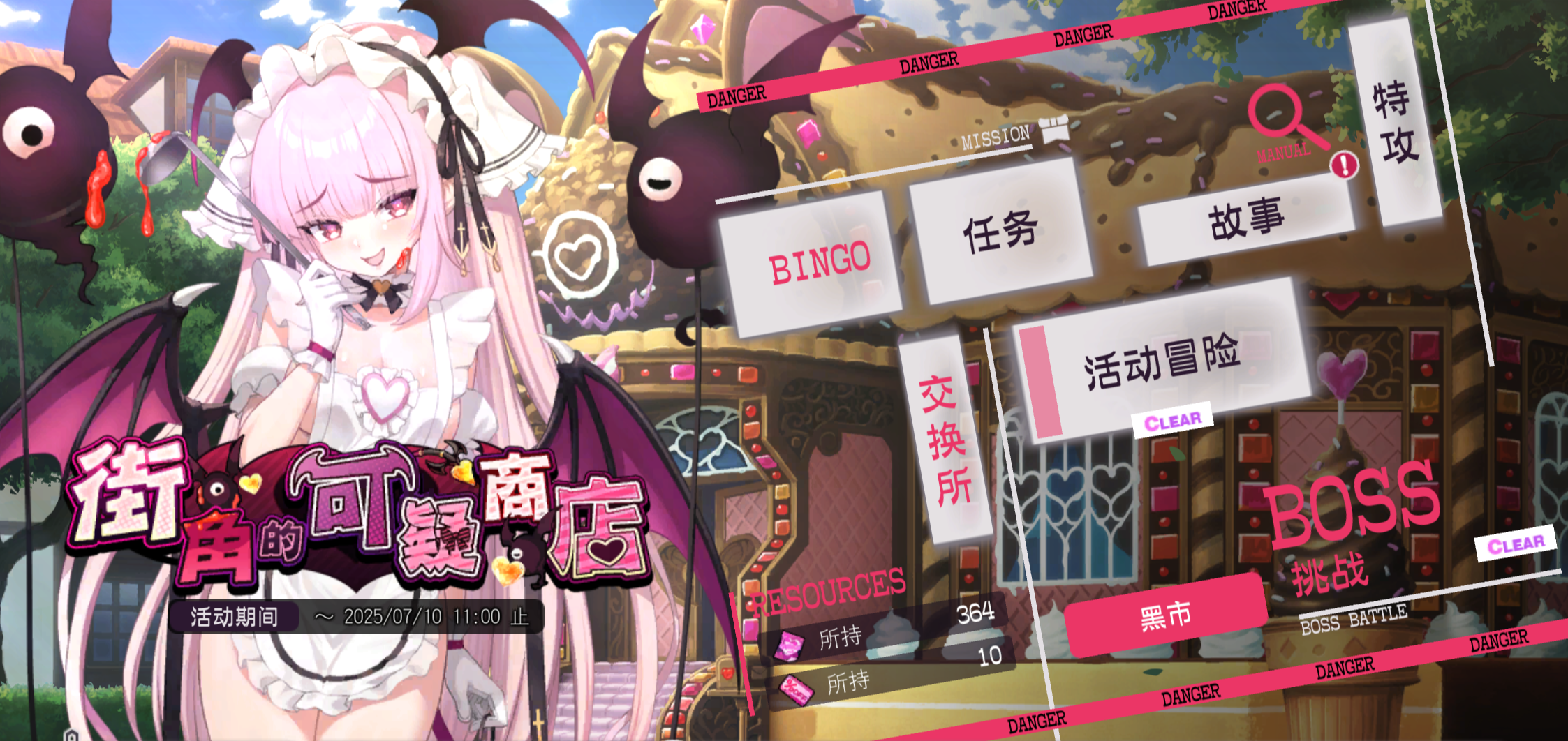 街角的可疑商店 活动图片(上半) 活动图片(下半) 活动信息 街角的可疑商店活动时间(上半首发)2025.6.26活动时间(下半首发)2025.7.3活动类型角色首发活动(双周)活动内容(上半)BINGO 游戏活动内容(下半)BINGO 游戏活动物品(上半)开业传单活动物品(下半)?活动卡池(上半)薇薇安限定池活动卡池(下半)圣枪·英利雅限定池上半商店下半商店
