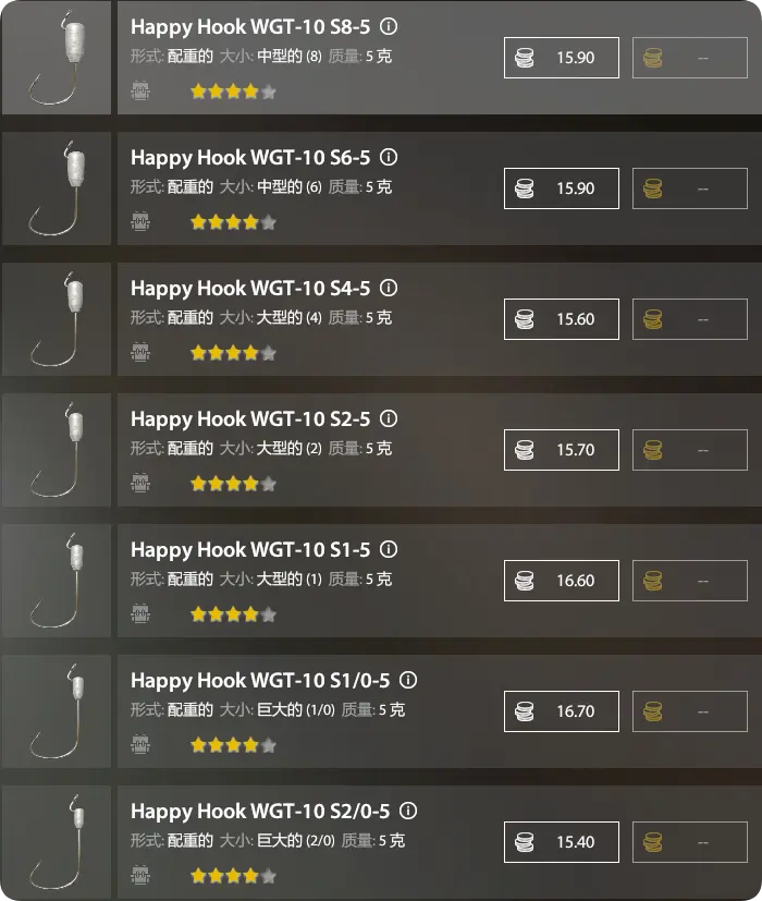 Happy Hook WGT-10 – Simmons公司制造的加重偏移钩系列。钩由钒合金,高碳钢制成,并且通过镀镍和聚合物涂料防止腐蚀。在不需要远抛的情况下,加重偏移钩通常用于在障碍地区绞钓或藻类丛生的浅水塘。
