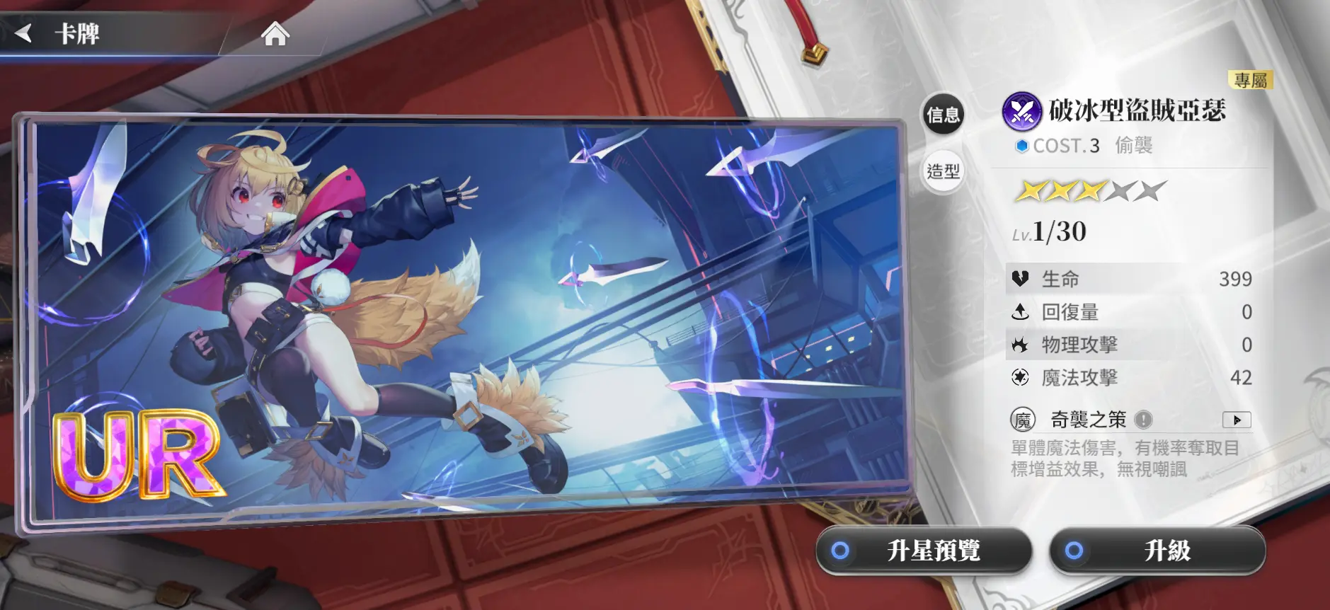 强袭:输出位,丘的物理和魔法攻击一样,都可以胜任。贼的物理攻击偏低,魔法攻击偏高,基本上是只打魔法的。输出位需要的就只有带上各类的增伤和伤害卡即可。