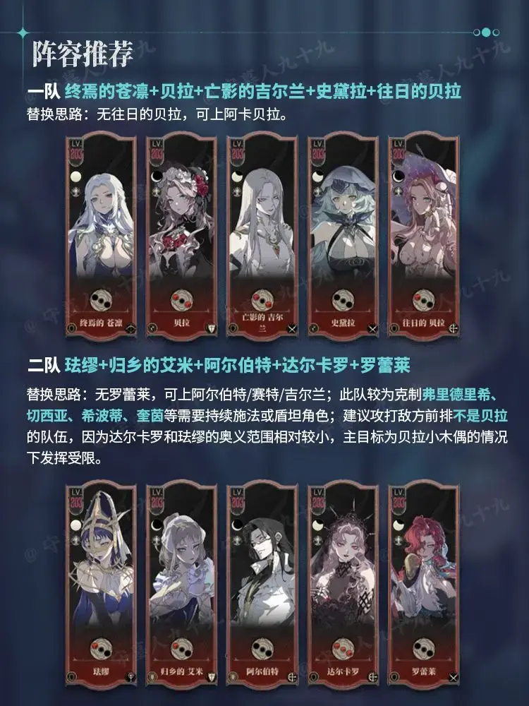 1v1阵容参考: 贝拉+奎茵+终苍+史黛拉+耶芙娜,耶芙娜提供控制带银白,可用阿伽莎替换,也可往日的贝拉、亡影的吉尔兰。