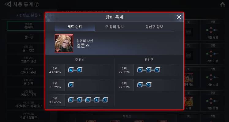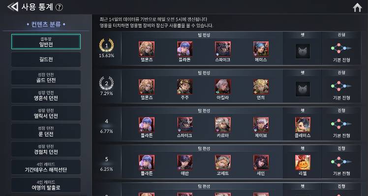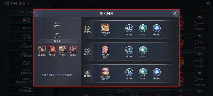 在“英雄统整系统”中点击(宠物头像),可以在阅览宠物的使用率排名时,同时会显示对应同时放置的英雄和阵型使用率排行,若点击(英雄头像),则会显示装备和饰品套装的使用率排行。