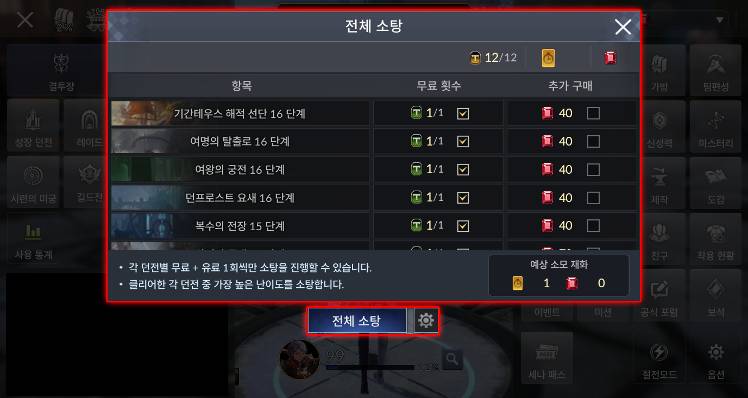 此次更新加入的“一健全扫荡”系统,可直接于(主选单)中进行选取,并可一次性地选择要进行的每日副本/团体战的扫荡功能。