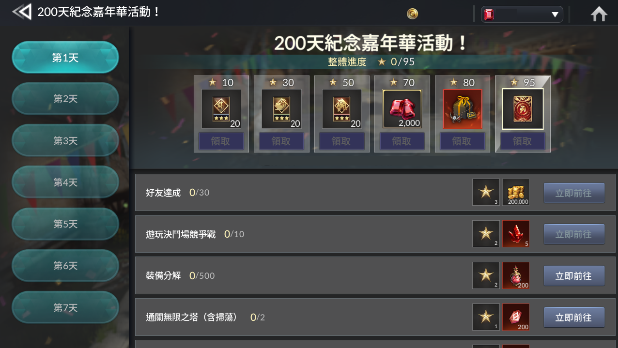 - 内容: 活动期间天天准时签到,即可获得200天纪念礼物箱及传说武器/防具选择券等多样道具。