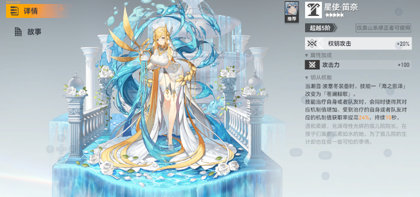 奶妈名字的由来,四个技能两个治疗,目前治疗最高的角色。根据攻击力加成提高治疗效果,使得她拥有不俗的治疗能力。