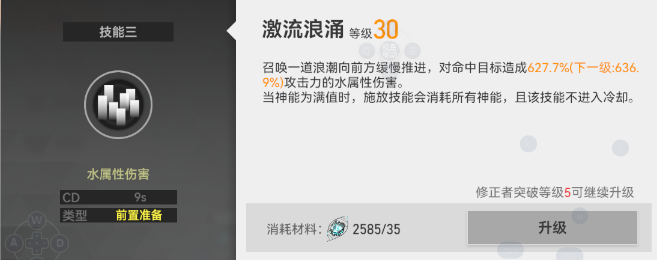 召唤一道浪潮向前方缓慢推进,对命中的敌人造成360%(满级:720%)攻击力的水属性伤害。