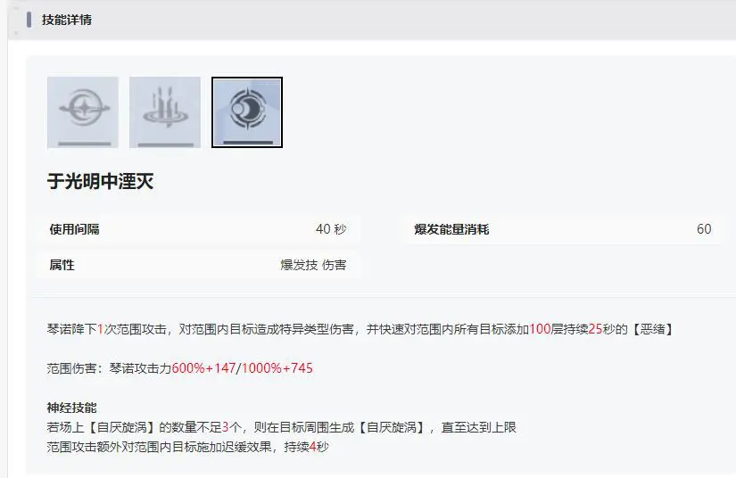 使用此技能纯粹叠层的速度不如平射,放技能的目的就是为了最后引爆的爆发伤害,这也是琴诺输出最高的攻击方式,由此看出琴诺的战斗思路完全围绕叠层-引爆进行展开。可以说每一次引爆就意味着一轮输出的结束,马上要进入下一轮的循环。