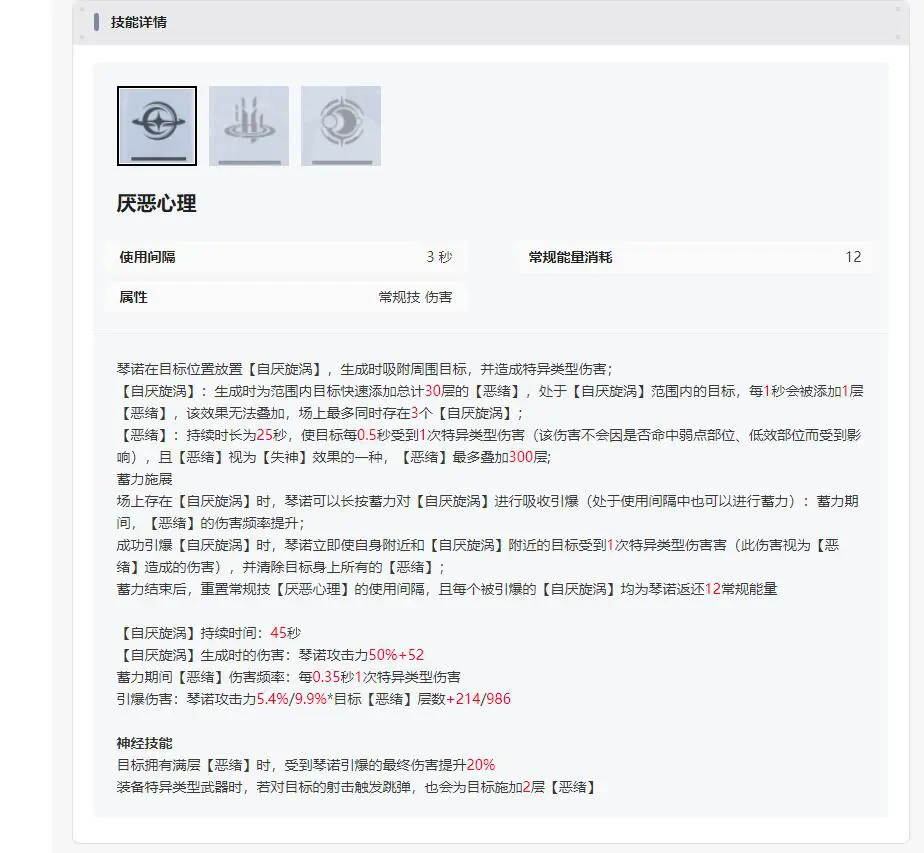 神经技能中最重要的就是跳弹也能积累恶绪层数,此效果为对冲锋枪高跳弹率的补偿,也保证了琴诺能对所有敌人进行有效的叠层。