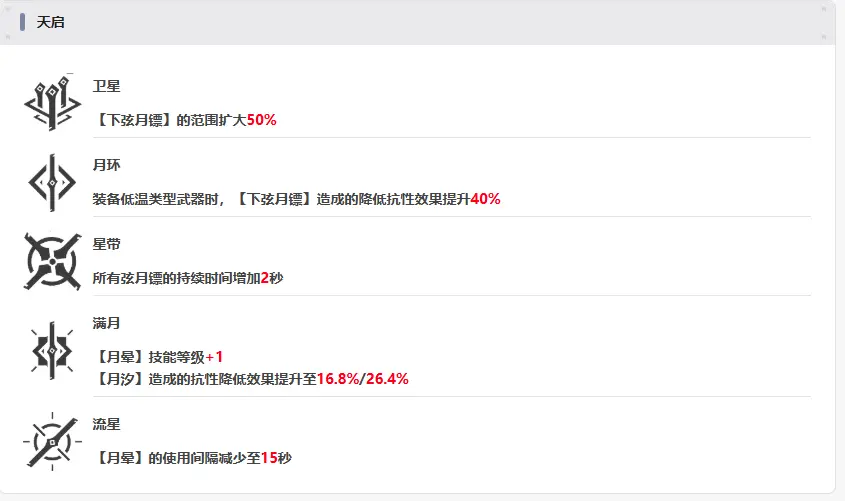作为第一个限定角色,辉夜的天启比较保守。2天启增加减抗需要专武才行,一般都用彩虹打火机就没用。345天启均有提升,但是成本较高没必要,因此大部分玩家0天启即可。有专武的可以考虑升到3天启。