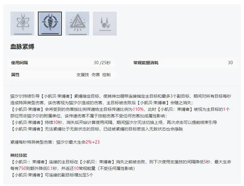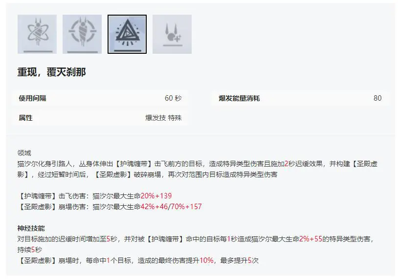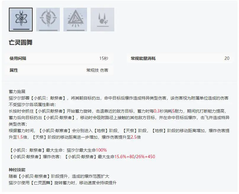 持续旋转蓄力后投出炸弹,点出神经技能后蓄力期间移速能接近正常速度,主要作用就是清杂。由于支援技期间溯影无法上场,再加上boss战以单体为主,算重要性很低的技能。