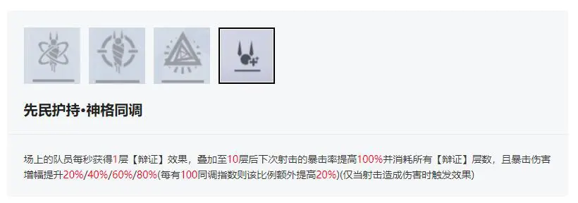 每10s给主C提供一次双暴增幅。乍一看暴伤增幅很高,但需要注意的是这游戏暴击伤害是由基础暴击伤害和增幅进行乘算的,所以对暴伤最高的狙击枪收益最高,霰弹则因为暴伤较低,收益一般。