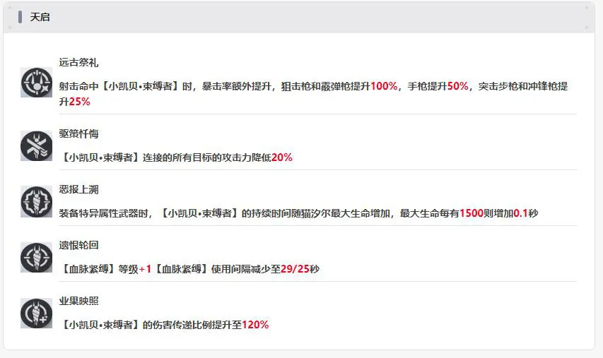 最重要的就是1天启带来的对木乃伊的暴击效果,这也决定了溯影最适配的就是狙击枪C位,其次是霰弹。可以说溯影是一个刚需1天启才能完全发挥的角色,如果有需要她上场的话记得优先她的个人任务。而如果你用来竞速的话,有没有3天启的差距是十分巨大的。