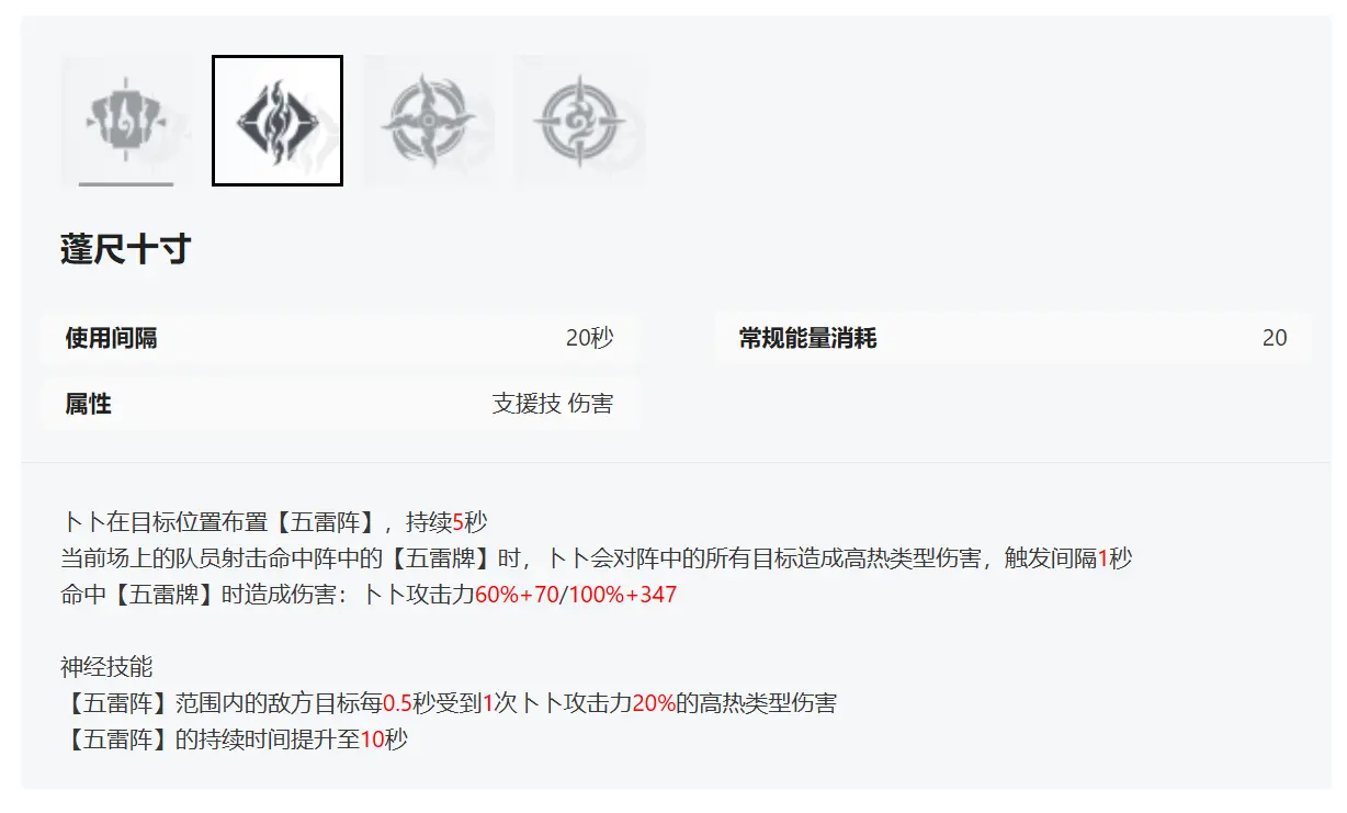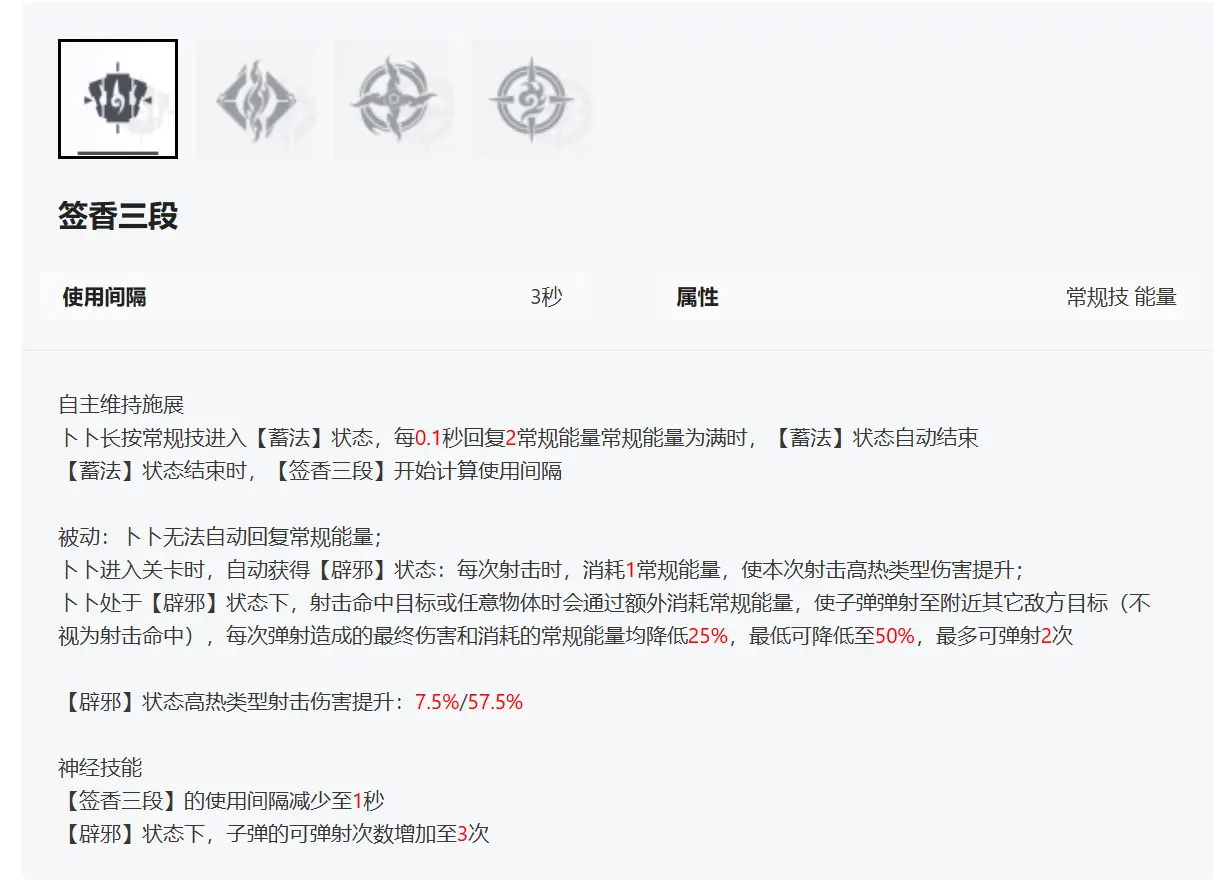 常规技是一个常驻的状态,即卜卜的射击会消耗常规能量并且无法自然恢复,但是会大幅提升射击伤害并打出弹射效果。而主动使用的效果就是简单直白的充能,需要持续施法,会快速的恢复常规能量。