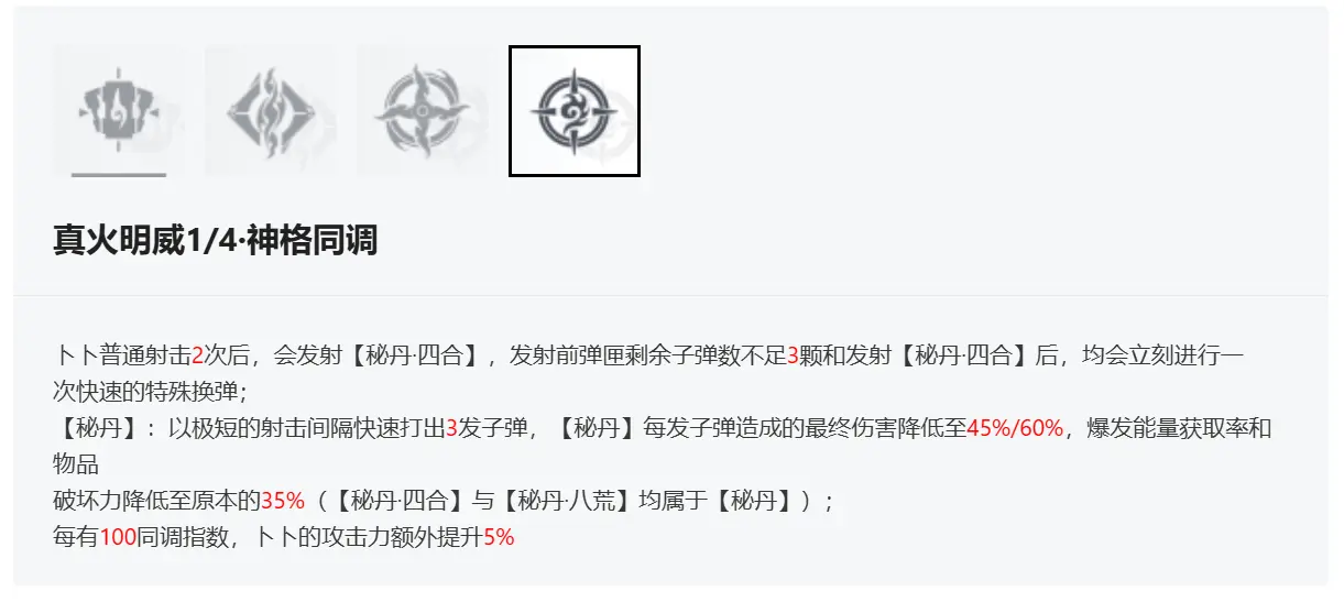 第三发子弹变为三连射+快速换弹,可以保证卜卜的射击手感持续不断。毕竟左轮手枪的弹仓只有6发,算上弹匣配件也只有7发,这样即使没有芬妮-辉耀,卜卜也不用在意换弹问题。