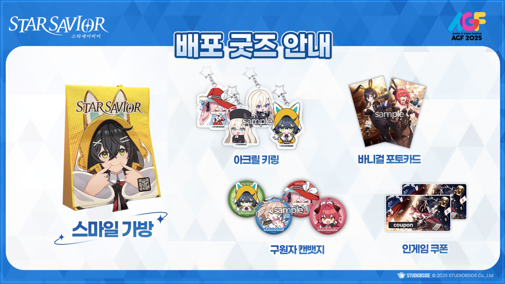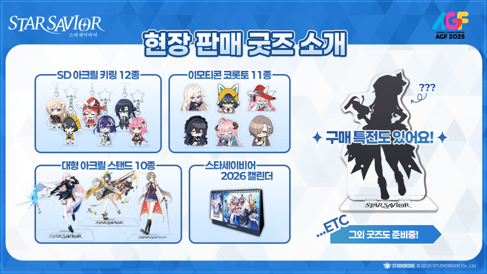 [星之守护者 x AGF2025] 周边商品介绍 星光守护者育成记。星之救世主! 您好,团长!我是负责联系的GM丽莎。 在此介绍将在AGF 2025活动期间赠送给各位团长的周边商品。 星际救世主展位准备了各种活动和特别商品, 欢迎光临,祝您玩得愉快! 此外,还将率先向现场的团长们公开部分全新周边商品。 还有更多周边商品准备就绪,千万不要错过! ※ 发售及贩售的周边商品、购买特典可能会提早售罄。 期待在即将到来的AGF 2025与各位团长见面! 谢谢。