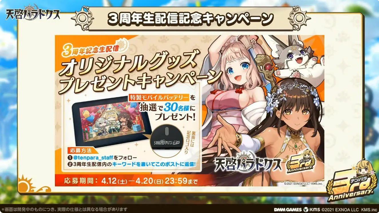 关注官方x(推特)并在相关推文下回复“謝罪で始まる3周年”,抽取30名玩家赠送限定移动电源