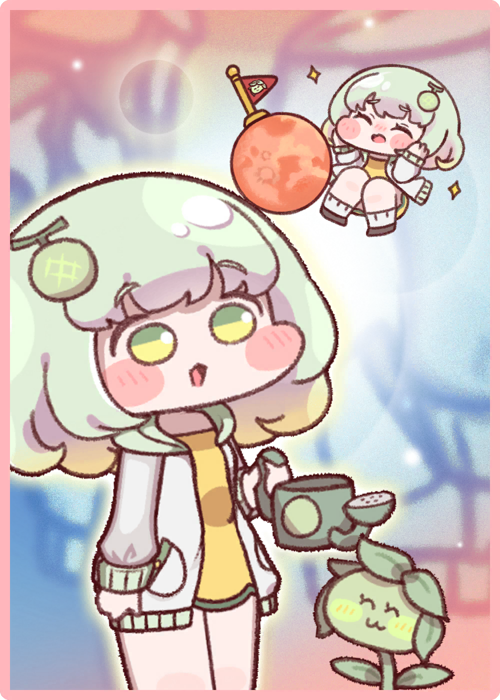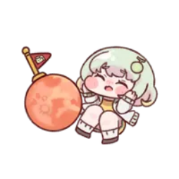 小小的火星旁边漂浮着梅卢娜,火星上有小小梅卢娜插上的旗子